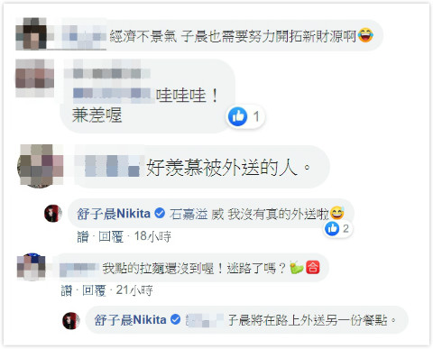 而照片一出,立刻引來許多網友熱烈回復,因為舒子晨的架式過於專業,許多粉絲信以為真,以為她真的加入熊貓外送員的一族,紛紛留言「經濟不景氣,子晨也需要努力開拓新財源啊」、「哇哇哇!兼差喔」、「好羨慕被外送的人」,讓她只好出面澄清表示:「威,我沒有真的外送啦」。但也有網友搞笑回應:「我點的拉麵還沒到喔!迷路了嗎?」讓舒子晨笑稱:「子晨將在路上外送另一份餐點」。
