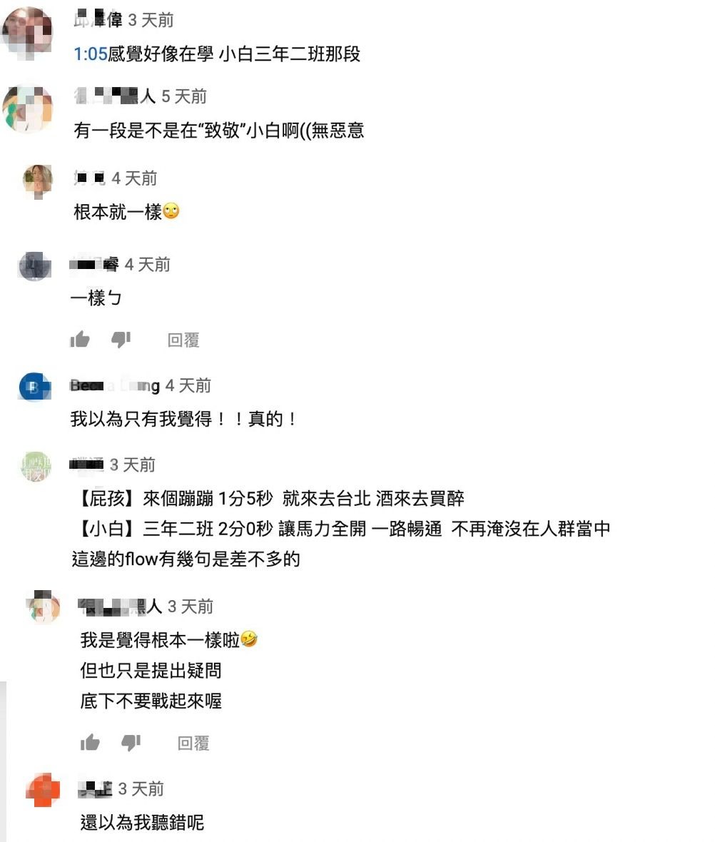 許多網友也將屁孩和小白兩句拿出來比較,紛紛留言說道:「這邊的flow有幾句是差不多的」、「還以為我聽錯呢」、「我也這麼覺得」、「有一段是不是在“致敬”小白啊」、「感覺好像在學小白三年二班那段」、「感覺好像小白的三年二班欸」,過去《聲林之王》第一屆有一位選手「林孟辰」也曾被指控總決賽歌曲抄襲PGONE,因此也有網友調侃表示:「為什麼聲林之王唱饒舌的,都那麼愛抄襲有嘻哈....」,引發熱議。