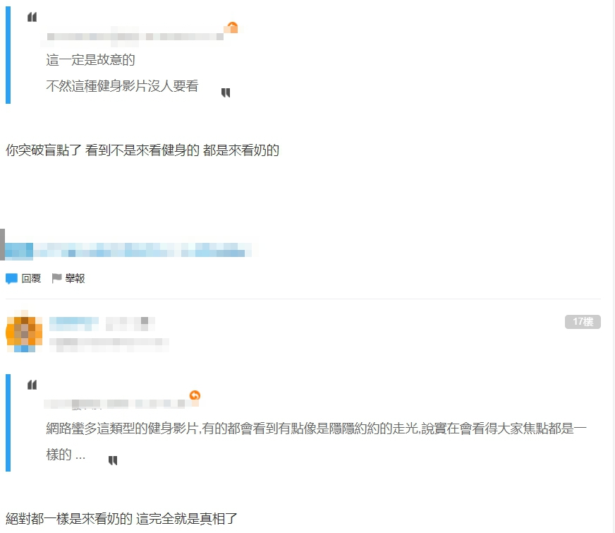 許多人看完影片,都一針見血的說:「這一定是故意的,不然這種健身影片沒人要看」、「你突破盲點了 看到不是來看健身的,都是來看奶的」、「網路蠻多這類型的健身影片,有的都會看到有點像是隱隱約約的走光,說實在會看得大家焦點都是這樣的...」、「絕對都一樣是來看奶的 這完全就是真相了」。