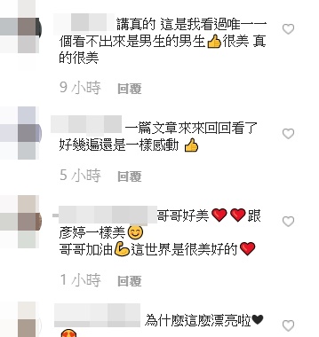 因限時動態的關係,許多人也找到5月份的文章,紛紛留言表示,「講真的,這是我看過唯一一個看不出來是男生的男生!很美!真的很美」、「哥哥加油!這世界是很美好的」、「哥哥好美」、「很漂亮耶!活出另一個很棒的自己」、「一篇文章來來回回看了好幾遍還是一樣感動」。