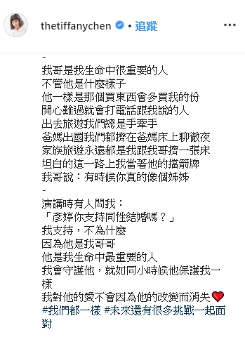 事實上,彥婷在5月時就曾分享過哥哥的故事,彥婷是家中老么,上面有6個哥哥,因此完全是家中的小公主。從小彥婷就和哥哥感情很好,爸媽不在家時,彥婷不明原因四肢全抽筋,哥哥二話不說就背著她直奔醫院掛急診,也因此兩人感情密不可分。彥婷當時感性表示,「他是我哥哥,他是我生命中最重要的人,我會守護他,就如同小時候他保護我一樣,我對他的愛不會因為他的改變而消失。」