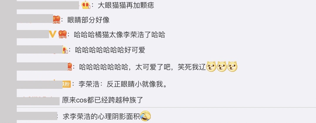 過去李榮浩也多次被網友曬出撞貓、撞狗的照片,在昨日微博上也瘋傳一張照片,照片中有兩隻貓雙手靠在欄杆上,一隻貓是橘色的且眼睛比較狹長;另一隻貓則是灰白色且眼睛相當圓滾可愛,這兩隻貓也被網友創了一個hashtag「cos李榮浩和楊丞琳」,網友也在留言區中說道:「李榮浩:反正眼睛小就像我」、「哈哈哈哈哈哈哈,太可愛了吧」、「哈哈哈橘貓太像李榮浩了哈哈」、「大眼貓貓再加顆痣」,該篇貼文更獲得了12萬的讚數,網友的討論也相當熱絡。