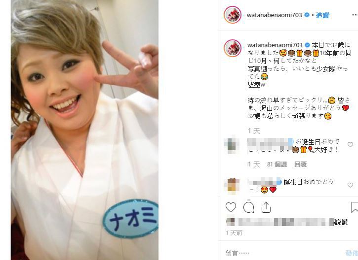 渡邊直美演藝圈生涯已過10年,23日,為慶祝32歲生日她也在IG公開2008年參與富士電視台節目《森田一義時間 笑一笑又何妨!》錄製畫面,當時的渡邊直美一頭金黃短髮,也看得出標誌的鵝蛋臉形,她也在文中感性表示「時間過得太快,一轉眼就過了10年,很感謝大家的支持與祝福,32歲也會繼續努力」。