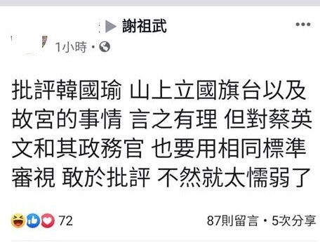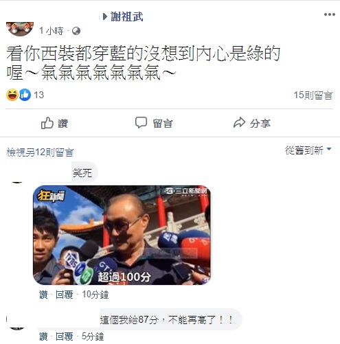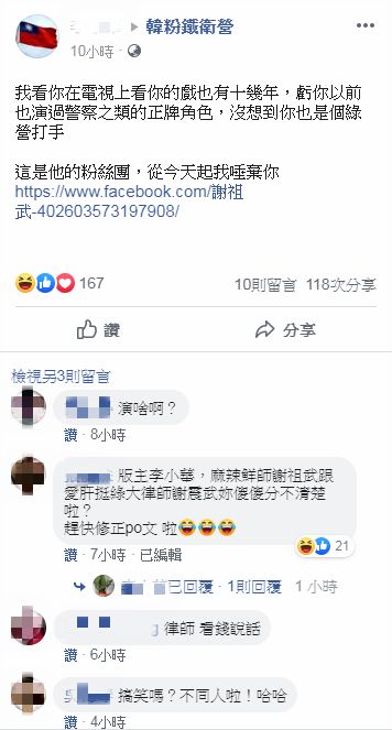殊不知,謝震武在節目中批評完韓國瑜之後,惹怒了廣大的韓粉,憤怒的粉絲們紛紛要到謝震武的臉書替韓國瑜抱不平!但不知道大家是不是不小心把「謝震武」跟「謝祖武」的名字給搞錯了,一大票的韓粉就這樣湧入謝祖武的臉書瘋狂留言謾罵說,「你憑什麼痛罵我們韓總統?」、「小小的藝人不怕引起公憤嘛?」、「韓總統年紀比你大,他是國民黨百年難得一見賢德之人,他說的一定是對的」、「沒想到你是綠營的打手,讓人心痛」、「不要以為代言氧氣人蔘就可以對韓總統下指導棋」。