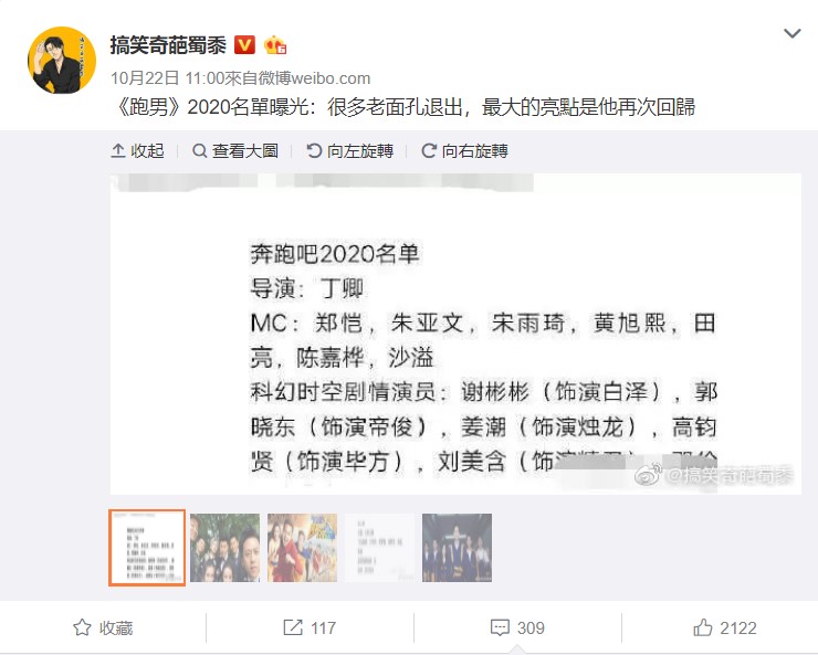 根據韓國SBS節目《Running Man》翻拍的《奔跑吧兄弟》,在中國已經成為王牌檔期節目,受到粉絲喜愛目前已播了七季。日前微博網友曝光出2020第八季的名單,在網路上引起了熱烈討論,對於《奔跑吧兄弟》每一季開播前都會在網被傳成員大換血,除了第七季隊長鄧超、陳赫、王祖藍、鹿晗都突然宣布離開,前六季整個核心團體幾乎沒有被改變過。