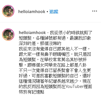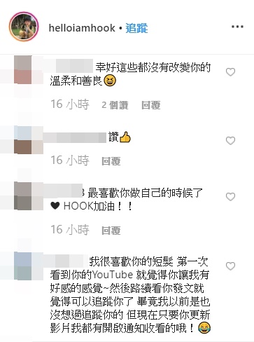 Hook將故事公布之後,不到一天的時間,便引來2萬多人按讚,其中也有許多網友紛紛送上溫暖表示,「短髮超好看!!做你最喜歡的自己就好了」、「幸好這些都沒有改變你的溫柔和善良」、「最喜歡你做自己的時候了❤ HOOK加油」、「喜歡自己的你超棒的!!!整個人很有光芒的」。
