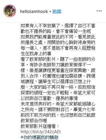 同時Hook也感性地說到,如果有人不幸放棄,選擇自己不喜歡、不擅長的路,是否會痛苦一生?「如果我們能尊重彼此的不同、看見彼此所擅長之處,用開放的心胸對待身旁的每一個人,是不是就不會再有人經歷發生在我身上的事。」最後Hook也勉勵大家,未來依然美好,盼大家能追隨心之所向,不要侷限自己!
