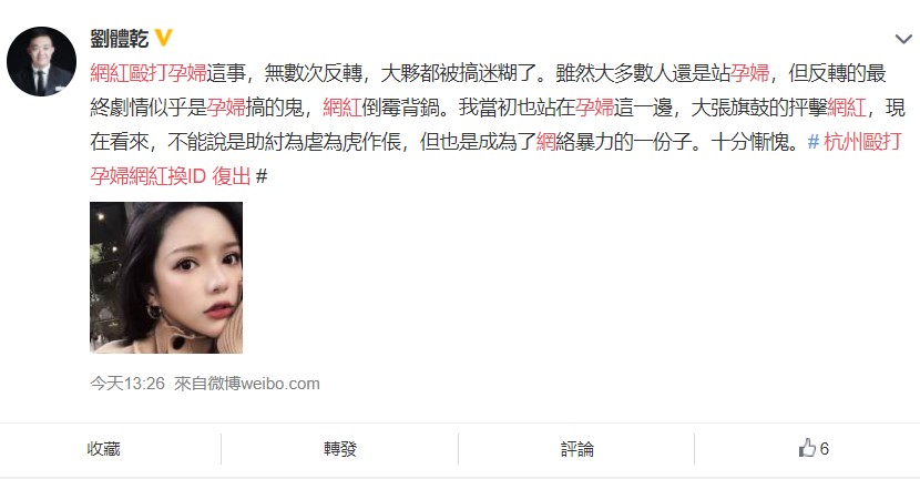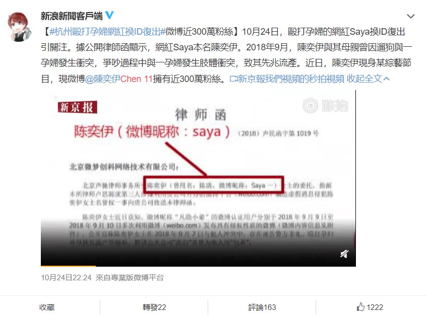 去年九月發生的杭州網紅毆打孕婦事件,最近又登上熱搜排行榜,整件事情有著反轉的趨勢。該名網紅Saye在最近將微博帳號ID改成陳亦伊Chen11,並且目前擁有將近300萬粉絲的追蹤,與當初一面撻伐風向非常不同,再度引發關注,網友們紛紛好奇整件事情是否反轉。