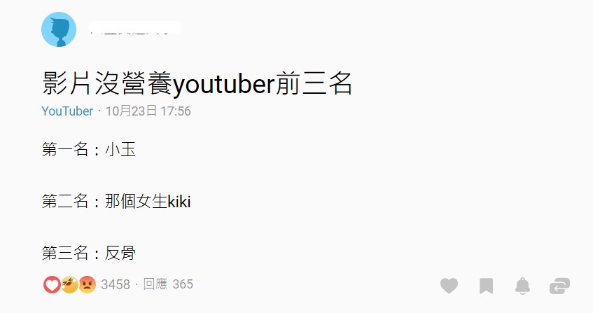 日前有卡友在YouTuber版上發表標題為「影片沒營養youtuber前三名」的文章,內文中原Po列出心中最沒營養前三名,依序分別為小玉、那個女生kiki和反骨。其中有兩部訂閱數都超過百萬點閱率。除了反骨男孩WACKBOY以大尺度風格為主題,小玉和那個女生kiki都是以生活中有趣的企劃和開箱文為主題。雖然原PO未多加敘述原因,仍引起留言一片混戰紛紛開始點名!