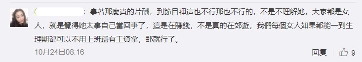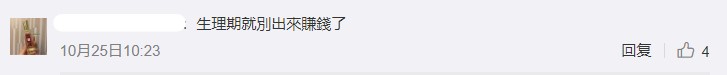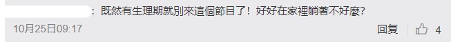 對於Anglebaby節目中的表現,開播後引起了網友的熱烈討論,部分網友對於Anglebaby生理期來表示同情和可以認同,但也有網友表示,竟然來上節目了就要有心理準備,如果身體不適可以延期檔期而不是到節目中耍特權。這件事件也上了微博熱搜排行,在評論區網友對於Anglebaby提前退出直呼「既然有生理期別來這個節目!好好在家躺著不好嗎?」、「生理期就別出來賺錢了」、「吃不了這個苦,就別挣這個錢」。