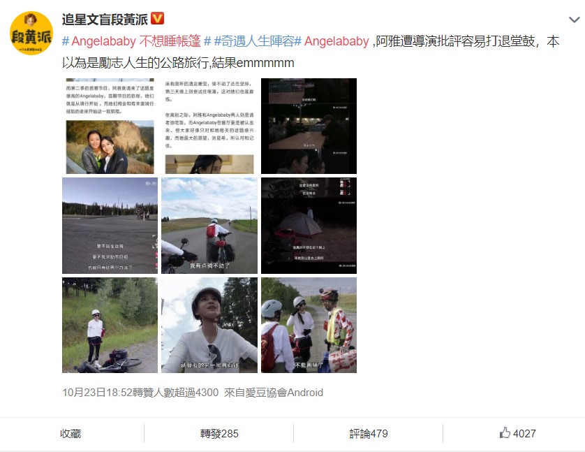 大陸女星Anglebaby(楊穎)日前參加大陸實境節目《奇遇人生》第二季,在節目中因為化妝時間太長以及不願意睡帳篷的行為,在節目播出之後,引起網友質疑太矯情。對於Anglebaby在節目中以生理期為藉口,與節目組提出許多要求,要在沒水沒廁所的野外搭帳篷與節目組起爭議。讓網友表示是不是太過於嬌貴,知道自己身體狀況怎麼還接節目、非常不敬業,Angelababy在節目中的表現也引起網友兩極討論。