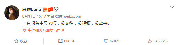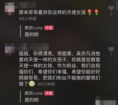 先前女方鹿依的社交網站遭網友留言「吳亦凡說他喜歡天使一樣的女孩子,祝福你們,希望你們幸福。」鹿依luna回復道「是的喲」,間接承認戀情。卻在近日,網友爆出他和鹿依的聊天紀錄,也再次回應了她和吳亦凡的戀情,只見聊天紀錄上寫著「我不擋他的路,剛牽手就被拍到,確實沒交往,你們想讓我怎麼說呢?」被網友質疑,早就有傳聞說她將要參加女版創造營,似乎想透過選秀節目出道,再來就是近日吳亦凡要發布新歌了,因此有不少網友質疑這次鹿依有此番操作都是為了炒話題。