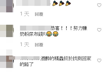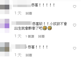 除了藝人、網紅好友現身祝福,另外也有2萬多名網友按讚,紛紛留言表示,「恭喜!!!努力賺奶粉尿布錢R」、「酒醉的精蟲終於找到回家的路了」、「抓周抓到酒瓶該怎麼辦呢?!」、「小孩該不會出生就會醉拳了吧」、「恭喜老爺賀喜夫人」。