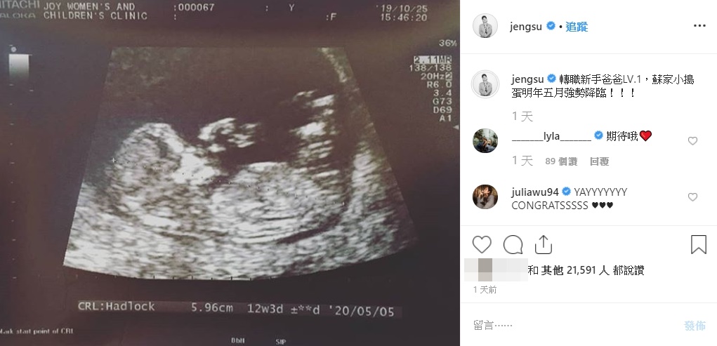 結婚幾個月後,恩熙俊很快地帶來好消息,在IG貼出一張超音波照片,驚喜宣布「轉職新手爸爸LV.1」,同時也透露「蘇家小搗蛋」將於明年5月強勢登場!消息一出,立刻引來許多藝人、網紅好友獻上祝福,留言區十分熱鬧。
