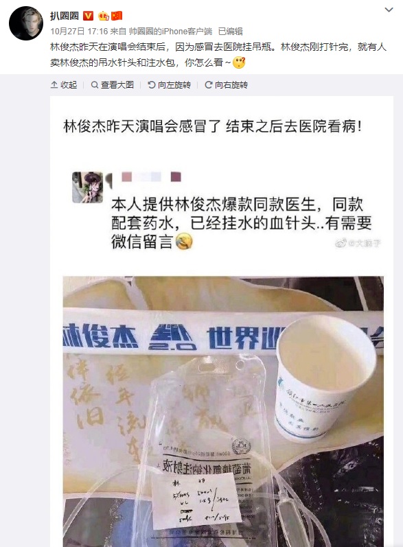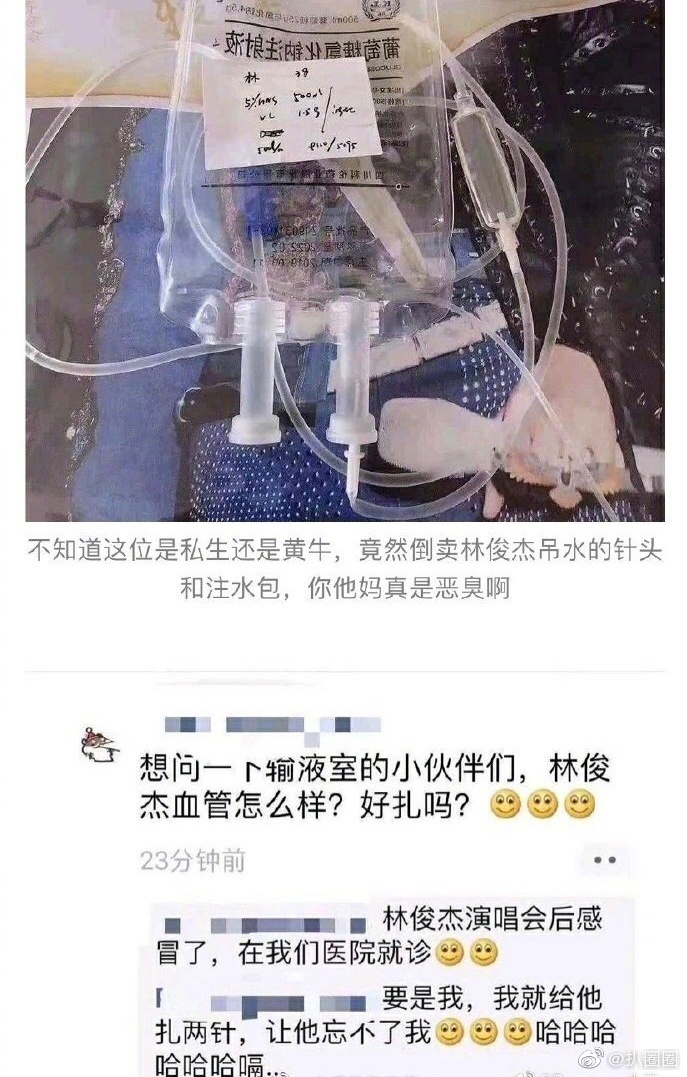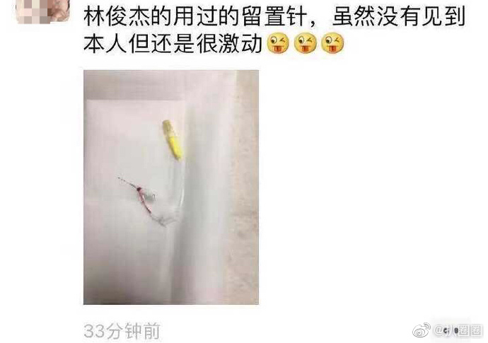 最近有網友在微博上熱烈討論林俊傑吊點滴的事情,我們從照片中可以得知,有一名網友在微信的朋友圈中貼出林俊傑所用過的「點滴袋」和「針頭」,而且上頭還寫著小小的「林」字,甚至連病例號碼都可以清清楚楚的看到!這位網友還在貼文中寫道,「本人提供林俊傑爆款同款醫生,同款配套藥水,已經掛水的血針頭...有需要微信留言!」