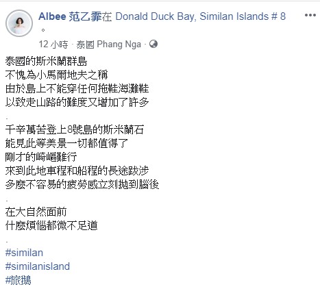 藍天、白雲、陽光,應該是大家公認最好的旅遊條件,陽光對於女生來說,應該也是又愛又恨吧?畢竟大家在旅遊之前,一定都會全副武裝,若是防曬沒做好,就會出現隱形的內衣。而藝人Albee范乙霏,最近也在個人臉書分享自己在泰國斯米蘭群島旅遊的照片和心得,文中提到有著「小馬爾地夫」之稱的斯米蘭群島,在他們當地,為了保護海洋環境,有規定不能穿任何脫鞋或海灘鞋上島,所以Albee只能穿上厚襪子走山路,整個過程可以說是非常艱辛,不過在登上高處「斯米蘭石」後,Albee望向美景,瞬間覺得走過這些崎嶇難走的路都值得了!
