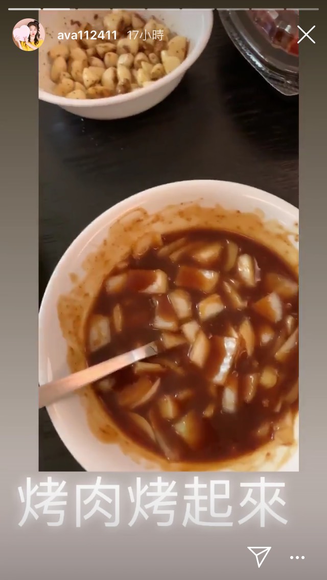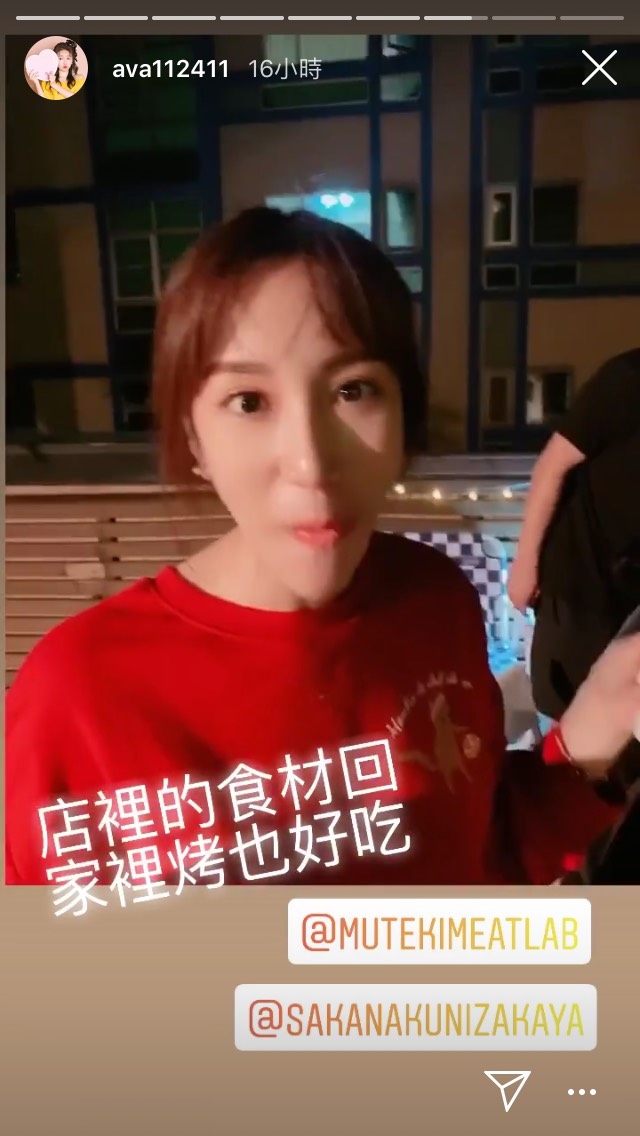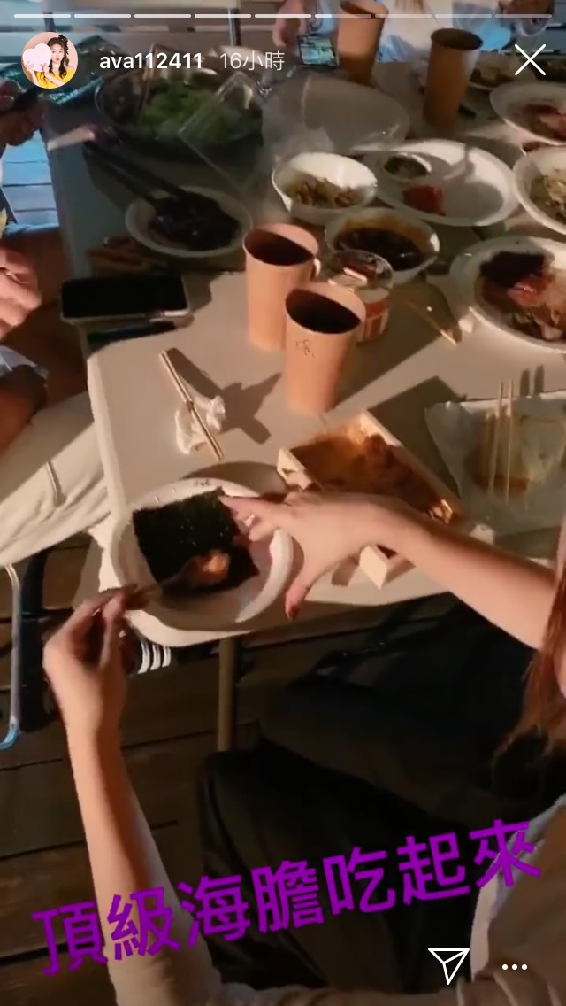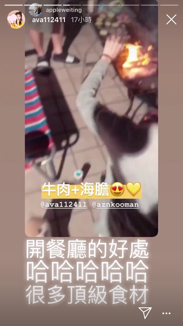 丫頭在28日晚上邀請了好姊妹Apple、瑤瑤和小優等三五好友一起到男友家的露台烤肉,我們從她的Instagram限時動態中可以看到,她開心的跟大家分享當天準備的美味食材,一打開就是海膽、牛舌跟超大雞屁股,還有她精心調製的醬料,烤肉過程中更以海苔包上滿滿海膽,而Apple一口咬下海膽就整個都滿到溢出來!讓人看了都忍不住猛吞口水啊~