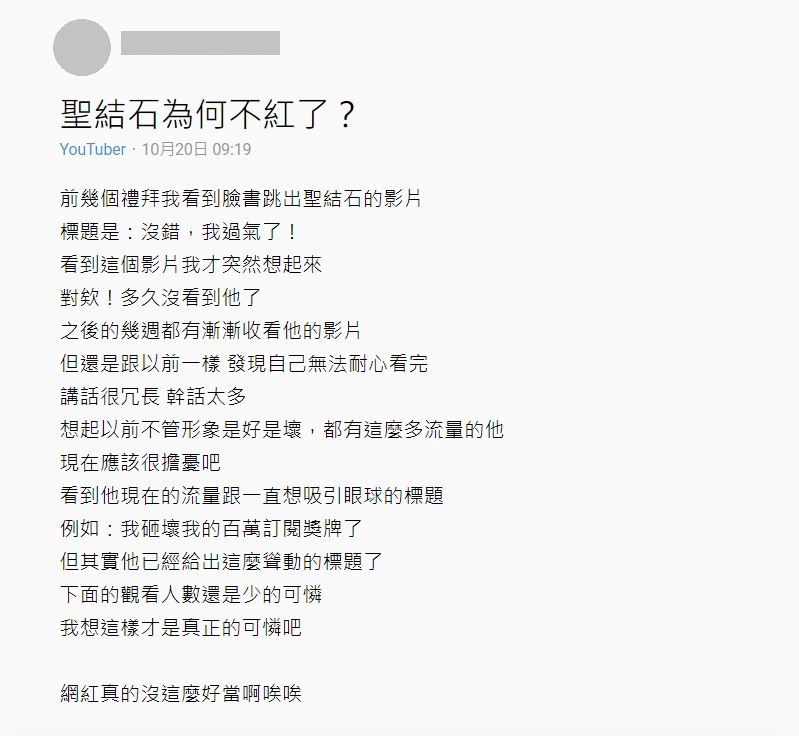 事實上,聖結石10月初曾發表「過氣宣言」,承認自己已經過氣,點閱數不如過往;上個禮拜,更是發佈「砸爆百萬獎牌」影片,撇除「百萬Youtuber」名號,只想當youtuber聖結石。然而聖結石一連串的行為,似乎沒有引起好感,也有網友曾在Dcard指出,「看到他現在的流量跟一直想吸引眼球的標題,他已經給出這麼聳動的標題了,下面的觀看人數還是少的可憐,我想這樣才是真正的可憐吧。」