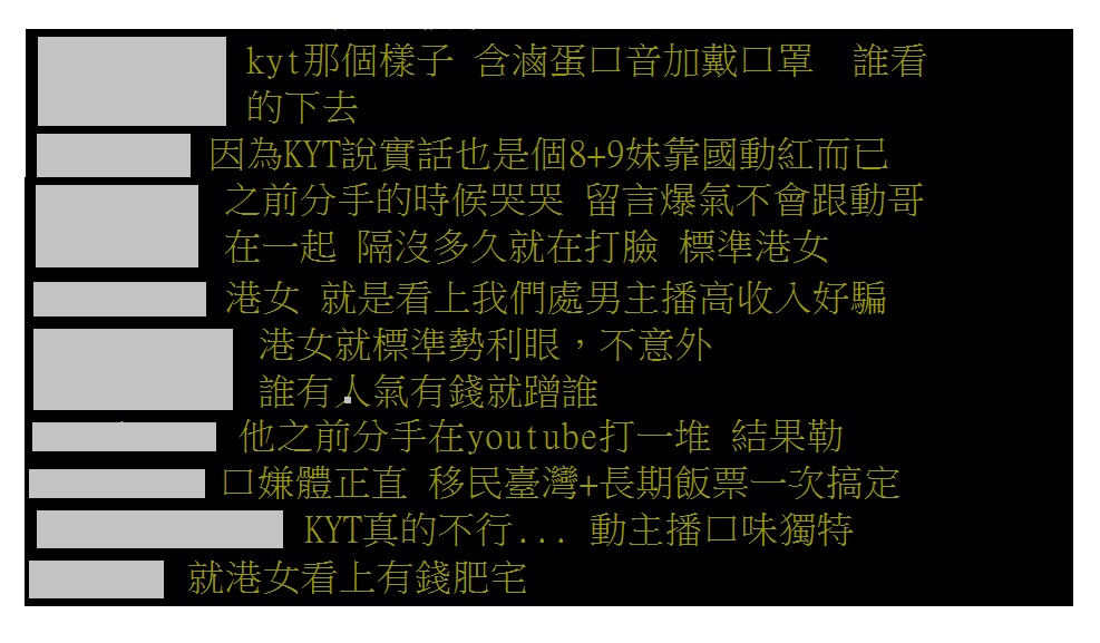 而反觀眾人對於「彥彤KYT」則大多呈現負面的態度,其最重要的原因在於過去「彥彤KYT」在經歷情傷時,對於國動的告白無動於衷,還爆氣留言回應「不會和國動在一起」,之後卻違背了當時所說的話,讓網友直言「彥彤KYT」就是靠著國動紅起來的,大嘆國動的眼光很差,紛紛留言表示「KYT那個樣子,含滷蛋口音加戴口罩,誰看的下去」「港女就是看上我們處男主播高收入好騙」「KYT真的不行」「就港女看上有錢肥宅」。