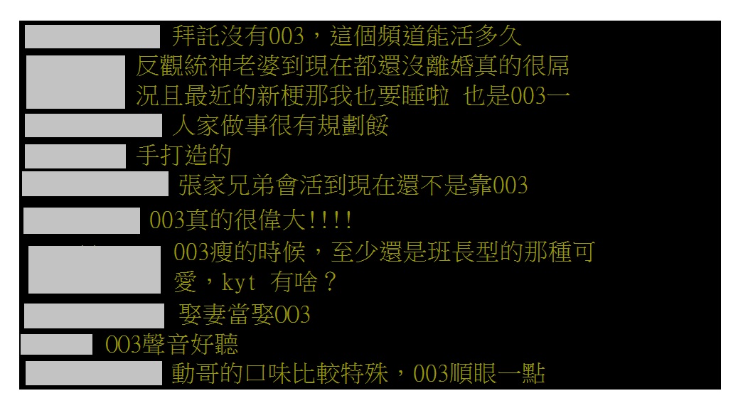 針對該名網友的發問,有許多網民則直言「張家兄弟會活到現在靠得就是003」「拜託沒有003,這個頻道能活多久」「最近的新梗那我也要睡啦,也是003一手打造的」,網們皆認為003不只是統神賢慧的老婆,更操持了整間公司的營運和管理,裡裡外外地打點了張家兄弟的事業,任勞任怨,除此之外,還有網友留言大呼「003順眼一點」「003真的很偉大」「OO3聲音好聽」「娶妻當娶OO3」,贏得了一片好評。