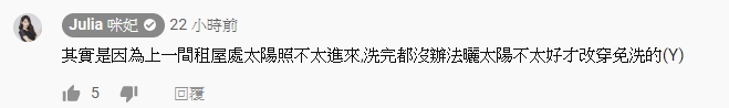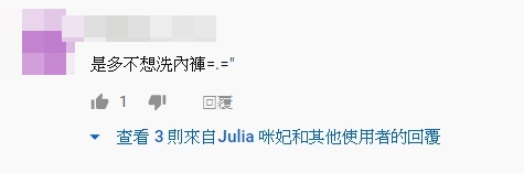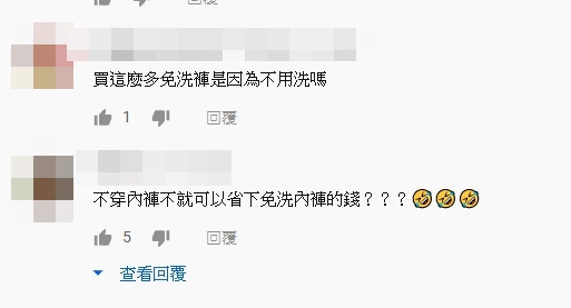 咪妃影片一出,引來不少網友留言,另外也有人注意到「免洗內褲」,紛紛留言表示,「買這麼多免洗褲是因為不用洗嗎」、「不穿內褲不就可以省下免洗內褲的錢?」、「哈哈,好懶,都用免洗的內褲」、「到底是多麼不愛洗內褲」。咪妃也現身留言區表示,「上一間租屋處太陽照不太進來,洗完都沒辦法曬太陽不太好,才改穿免洗的」。