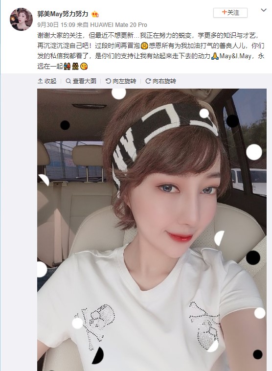 郭美美在出獄後的第一篇微博表示,「謝謝大家的關注,目前正在努力蛻變,學更多的知識與才藝,在沉澱沉澱自己」,後續也貼出出國旅遊的照片,由於出遊照片遭網友發現,消費檔次很高,鼻子跟之前有些不同,網友紛紛批「出獄火速整容,厲害」、「立馬整容了阿」、「五年你鼻子會長高」。