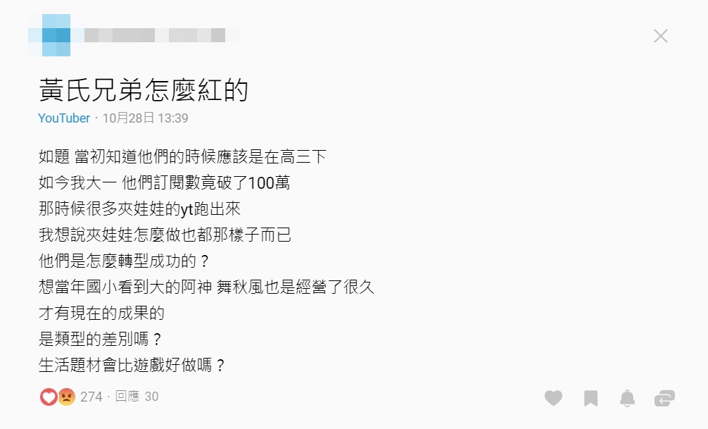 日前有網友在Dcard發文表示,「當初知道他們(黃氏兄弟)的時候應該是在高三下,如今我大一,他們訂閱數竟破了100萬」!對於爆紅情況,原PO十分納悶,因此提出心中疑問「那時候很多夾娃娃的yt跑出來,我想說夾娃娃怎麼做也都那樣子而已,他們是怎麼轉型成功的?是類型的差別嗎?」
