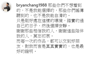 張書豪日前也在Instagram發文,表示「那些你們不想看到的,不是我能選擇的,那些你們謠傳聽到的,也不是我能自清的。謝謝那些相信我的人,謝謝這些陪伴我的人,莫忘初衷。而每一次的作品,都可以交到好朋友,對我而言是真真實實的,也是最好的證明。」吐露心聲。
