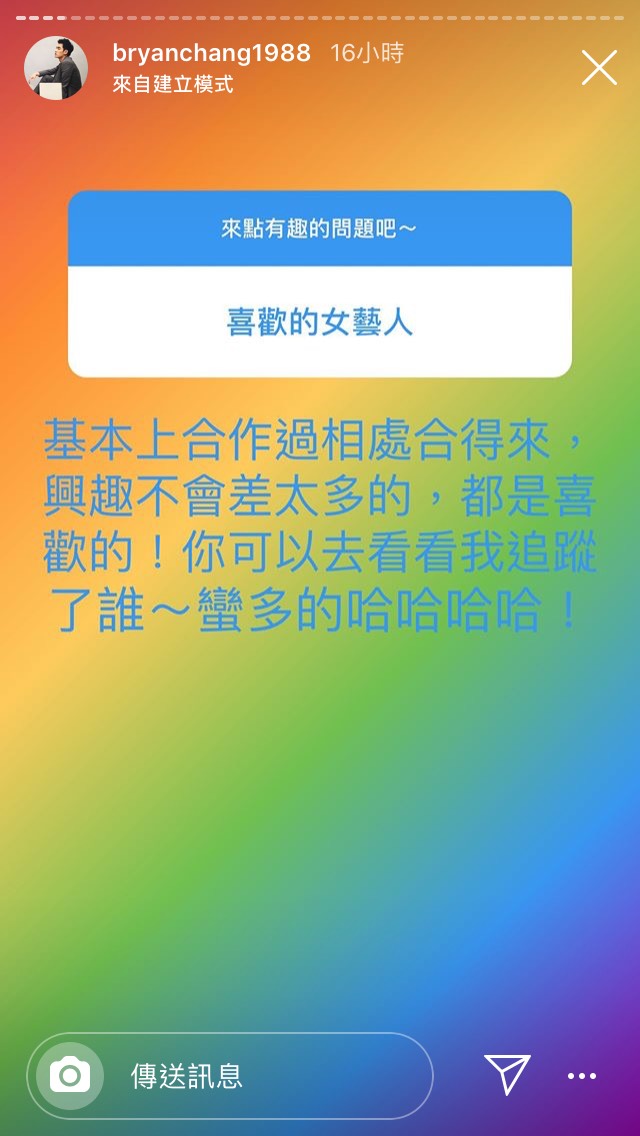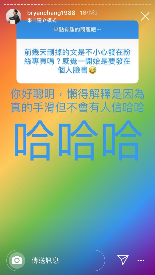張書豪昨天(29日)在IG限時動態,開放讓網友提問互動,其中有位網友就問,「前幾天刪掉的是不小心發在粉絲專頁嗎?感覺一開始是要發在個人臉書」,而張書豪直接承認,「你好聰明,懶得解釋是因為真的手滑,但不會有人信」。看的出他對於手滑誤發一事很無奈。但他對於與歐陽妮妮的相關話題似乎依舊避而不談,另外有其他網友問「喜歡的女藝人」,張書豪沒有直接回答,只表示「基本上合作過相處合得來,興趣不會差太多的,都是喜歡的!你可以去看看我追蹤了誰~蠻多的」。