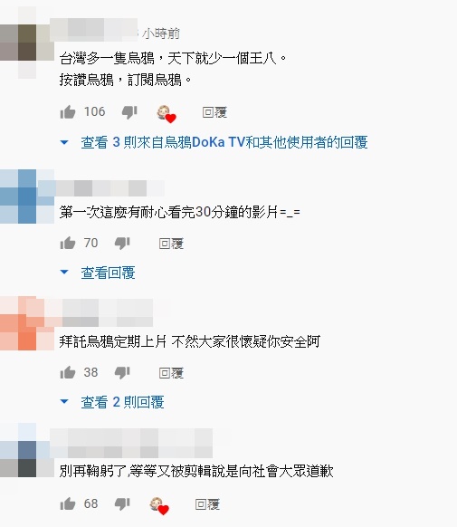影片一出,立刻衝上Youtube熱榜,同時也湧進上千多名網友留言支持,「台灣多一隻烏鴉,天下就少一個王八。按讚烏鴉,訂閱烏鴉。」、「只有烏鴉敢說真話」、「持您導正現今社會歪風亂像;真相永遠是站在正義一方,加油!」、「難怪覺得新聞標題怎麼都怪怪的,這影片整理得太好了,支持烏鴉」、「一路走來始終如一的流言終結者~烏鴉」。