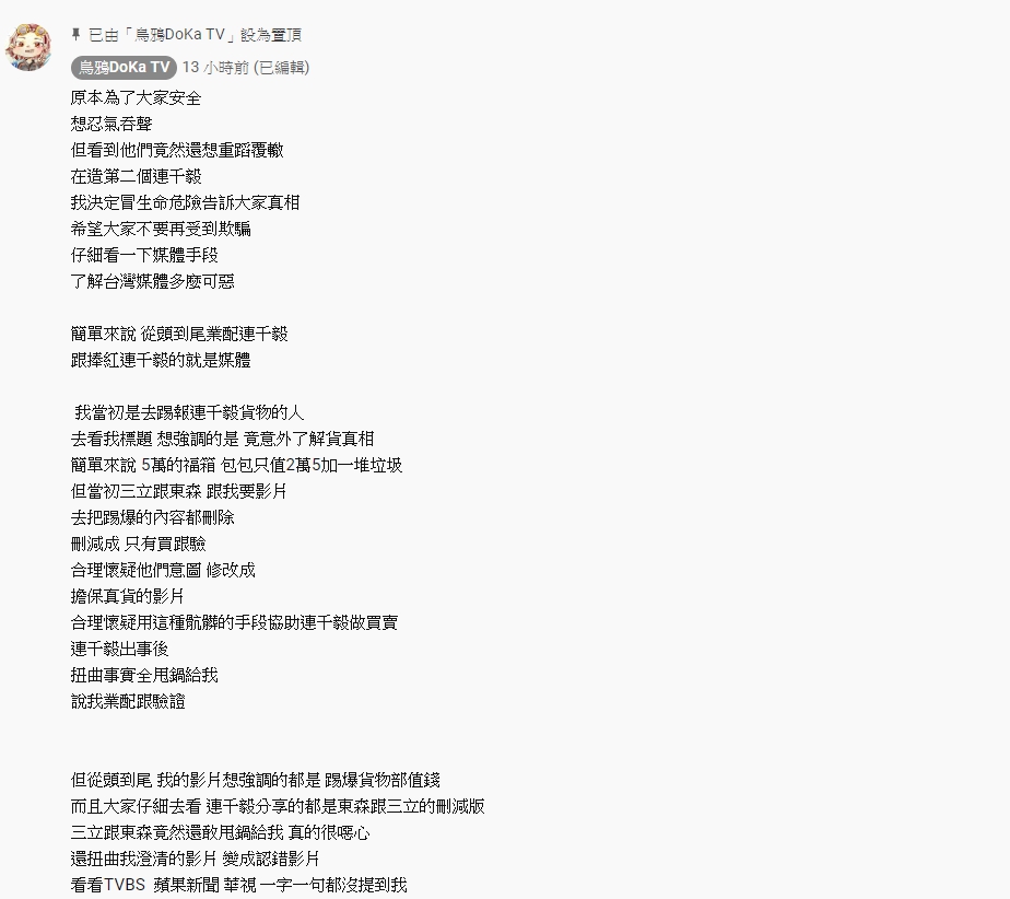 Youtuber「烏鴉Doka」目前擁有70多萬訂閱,經常分享夾娃娃、開箱、都市傳說等影片,以炫富和灑錢實測的拍攝方式走紅,然而過去一支「驗貨影片」,卻讓他深陷「連千毅之亂」!日前有媒體報導將烏鴉貼上「業配、驗證連千毅貨物」的標籤,讓風向跑到烏鴉身上,一連串操作讓烏鴉忍無可忍,決定親身槓上媒體「踢爆真相」!