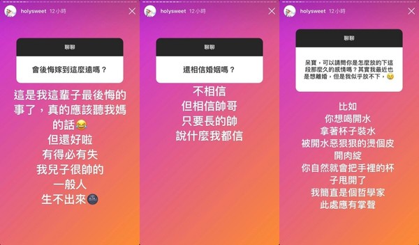 然而在昨日呆寶靜也在限時動態中回覆網友的提問,其中有一位問到「會後悔嫁到這麼遠嗎?」,呆寶靜也坦承這是她這輩子最後悔的事,提到:「真的應該聽我媽的話,但還好啦有得必有失,我兒子很帥的,一般人生不出來」,展現出相當樂觀的態度。接著也有網友提問「呆寶,可以請問你是怎麼放的下這麼久的感情嗎?」,而她也用熱水與杯子的理論來解釋:「比如,你想喝開水,拿著杯子裝水,被開水惡狠狠地燙個皮開肉綻,你自然就會把手裡的杯子甩開了」,此番言論也令許多粉絲感到非常心疼。