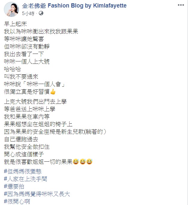 金佛老爺隨後也在臉書中分享小孩的生活照,並且感嘆著孩子的長大,起初擔心因分房睡關係,女兒一早會直奔找媽媽,沒想到女兒一早獨立的在馬桶上大號,且女兒可愛的表示「咪咪一個人會」,對於女兒獨立行為感到非常驕傲,網友也有感的表示「果果,咪咪,真的長大了」。