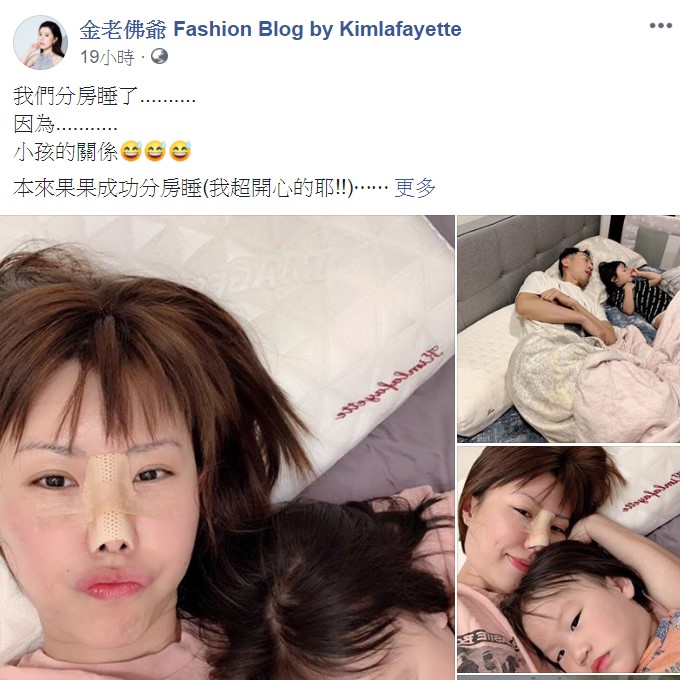 昨日金老佛爺以「我們分房睡」作為文章開頭,震驚不少網友,以為婚姻出現危機!不過仔細一看發現,原來是因為兒子果果的關係。金老佛爺在文中表示,果果半夜從睡夢中驚醒後,發現只有獨自一人時,就會害怕的大聲哭鬧,但因為一張床睡不下4個人,加上金老佛爺怕鼻子被踢到,因此最後決定與老公一人帶一個小孩分房睡,結束這場家庭風波。