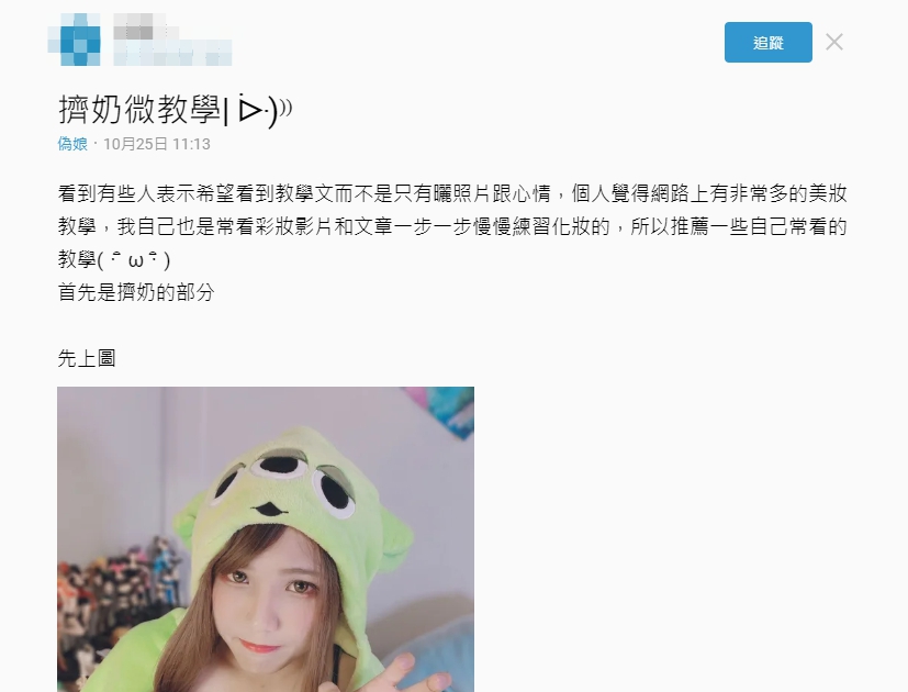該名發文的網友本身也是一名偽娘,他在文中曝光的偽娘照就像一名長相精緻的女生,讓網友十分驚訝,完全無法相信他竟是男兒身!照片中,有著一頭柔順長髮的他,瀏海微微撥向一邊,臉蛋十分小巧,皮膚也相當白皙,一雙大眼睛透露出無辜的模樣,因為骨架窄小的關係,完全看不出是一個男孩子。除此之外,他還大方秀出自己的「乳溝照」,讓一群網友驚呼連連。而這名網友也大分透露「擠乳技巧」,表示自己只是用兩層nubra把胸前所有皮膚用力貼在一起,「讓看的到的地方看似飽滿有溝」,並謙稱自己身材稍微肉一點,所以「有更多東西可以擠,其他地方都是墊起來的」。