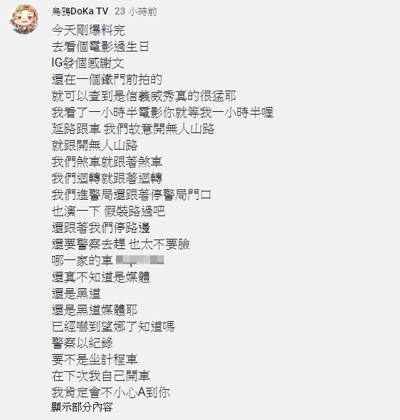 爆料影片一出,烏鴉便在Youtube社群爆出「跟蹤事件」!烏鴉表示,當天在IG發完生日感謝文後,疑似被搜出行蹤,因此看完電影便被「沿路跟車」,即使開到無人山路,該車輛也緊追不捨,讓烏鴉決定直接開到警局,沒想到對方也跟著停在路邊,直到警察出面才結束這場跟蹤風波。