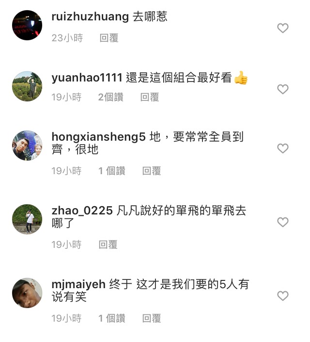 然而30號十,反骨男孩在instagram上驚喜po出五個人的合照,大呼「凡回來了!一家人笑哈哈」,以行動打破了焦凡凡退團傳言,讓粉絲又驚又喜,湧入欣慰留言「還是這個組合最好看」「要常常全員到齊」「這才是我们要的5人有说有笑」,也有粉絲心疼表示「凡凡真的瘦了」。