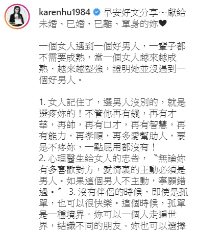 最近小禎也在instagram上有感而發地分享了一篇文章,總結12點對所有女性朋友的感情建議,文裡提到「女人記住了,選男人沒別的,就是選疼妳的!」、「有些人適合妳但不愛,有些人愛妳卻不適合。」、「如果一段感情,沒有把妳變成更好的人,那麼很遺憾你跟錯了人。」、「有些男人愛妳,是想跟妳過一輩子。有些男人愛妳,只想和妳過一陣子。」、「男人對女人的傷害,不一定是他愛上了別人。」...等,引起網友們強烈的共鳴!