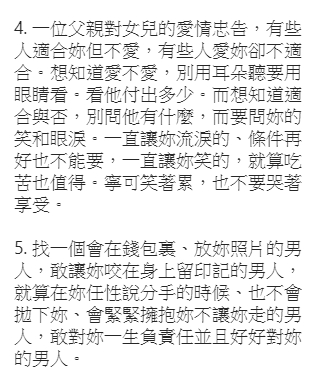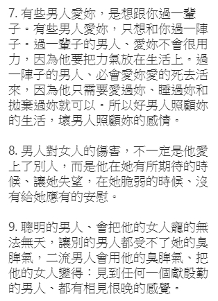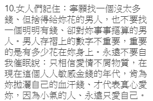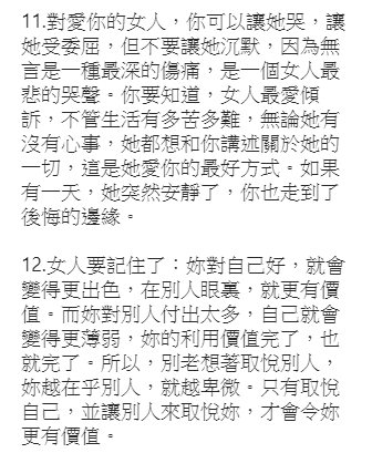 文末也感性的做了一個總結,「女人要記住了,妳對自己好,就會變得更出色,在別人眼裏,就更有價值!」提醒各位女性朋友,「別老想著取悅別人,妳越在乎別人,就越卑微。只有取悅自己,並讓別人來取悅妳,才會令妳更有價值。」、「一輩子不長,記得對自己好一點。