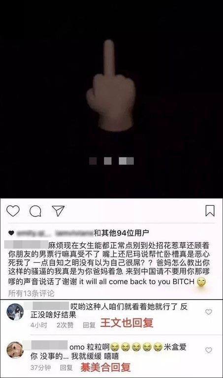 兩人曾是同個千金閨密團的好友,沒想到現在為了一個男人就此一拍兩散,昔日的合照看起來相當令人覺得唏噓不已,覺得被歐陽娜娜搶走劉飛宇的綦美合,儘管沒有在網路上多說什麼,不過綦美合的好友「王文也」則是在網路上替好友出一口氣,雖然沒有明說,但各種方向都在暗指歐陽娜娜是Bitch,然而綦美合不僅有按該則貼文讚,同時也有留言。