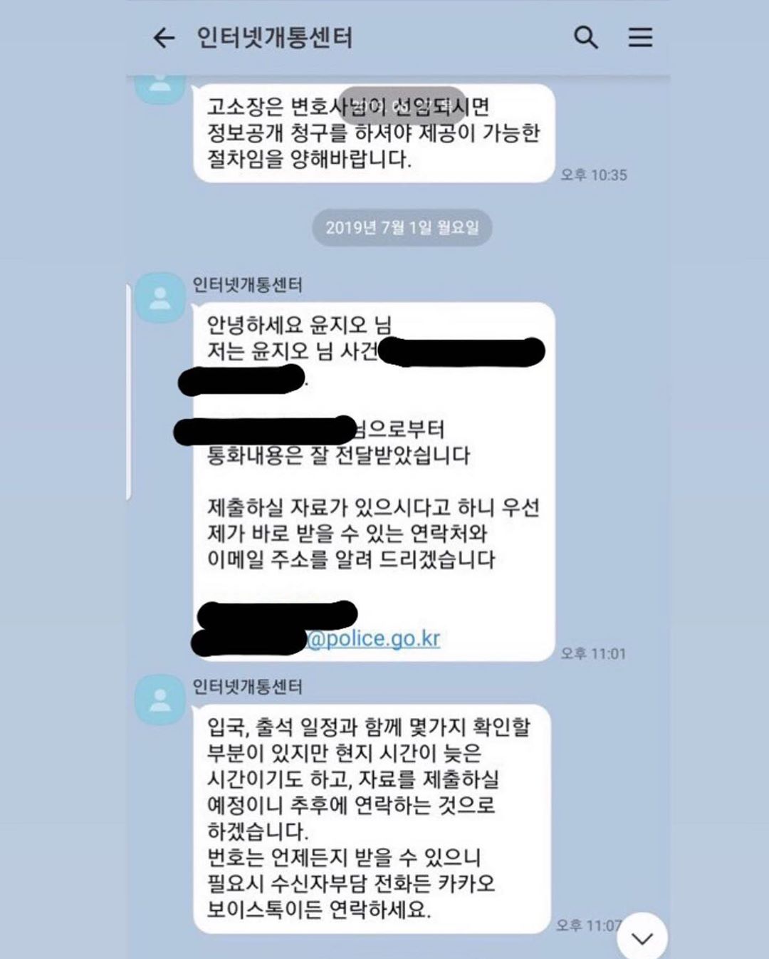 飽受流言所擾的尹智吾也在IG上公開反擊,表示警察是用韓國通訊軟體「Katalk」聯繫她,其中還包含出席要求等重要資訊,「很難相信警方的身份」,文章最後她更強硬抨擊:「你們在害怕什麼?你們到底想掩蓋什麼?」質疑警方沒有及時調查,就直接將犯罪者的帽子扣在檢舉人和證人頭上。