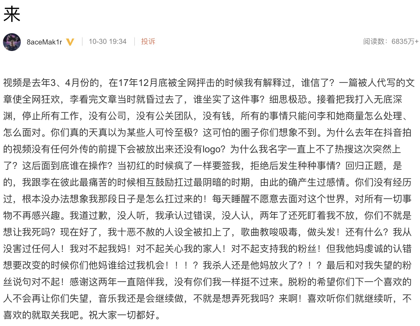 30號下午微博出現了三段PGONE與李小璐的親密影片,兩人除了在鏡子前自拍之外,更穿著情侶裝在沙發上大玩手指舞,接著更在鏡頭前嘴對嘴接吻,宛如熱戀中的情侶,然而影片曝光後PGONE也在當天晚上發文寫下:「視頻是去年3、4月份的,在17年12月底被全網抨擊的時候我有解釋過,誰信了?」、「是的,我跟李在彼此最痛苦的時候相互鼓勵扛過最陰暗的時期,由此的確產生過感情」,接著他表示自己已經認錯也想改過,卻沒有人願意給他一個機會,更直言:「我殺人還是他媽放火了」,言詞間流露出憤怒。