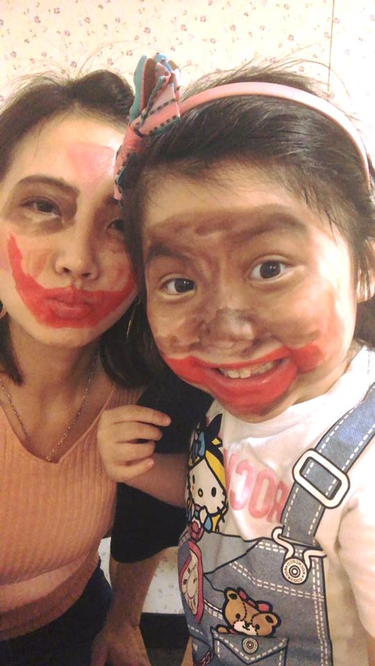 謝忻近日在社群上面大方的PO出了萬聖節妝容的照片並寫道,「理想中的萬聖節vs.現實中的萬聖節」,我們從照片中可以看到,有一張照片是她穿著深色的深V低胸禮服,配上相機的小丑妝濾鏡,讓自己看起來很像憂傷又性感的小丑女!而另外一張照片則是她跟小朋友一起畫著非常陽春的妝容,臉上紅一塊、黑一塊的,看起來非常童趣可愛!