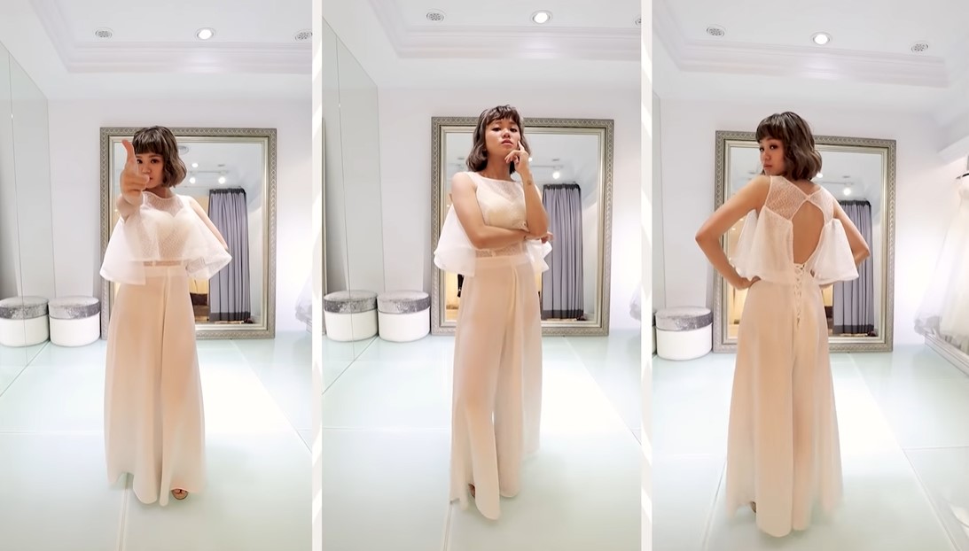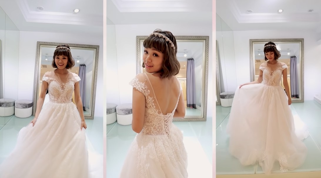影片中彥婷由婚紗設計師幫忙選了六套適合小隻女的婚紗,每套都有著不同的風格,有現代、典雅、經典、性感和活潑等六種不同的風格,在穿搭過程中,彥婷對於新娘為甚麼在婚禮都不吃飯感同身受,才知道每件婚紗的腰身都是非常貼身,新娘為了讓自己美美的,其實都是努力緊縮著小腹在維持。