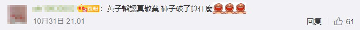 畫面曝光後,網友們紛紛留言表示:「劇組塑造人物的服飾也太真實了吧?」、「哥沒發現凉快嗎?」、「果然入戲太深!」。另外一方面也有網友大讚黃子韜的演技越來越好,本身就有武打底子的他,對於劇中許多的打戲,可以說是動作乾淨俐落,粉絲對此也給出正面的肯定:「黃子韜認真忘我,這才是真演員」、「黃子韜認真敬業、褲子破了算甚麼」。