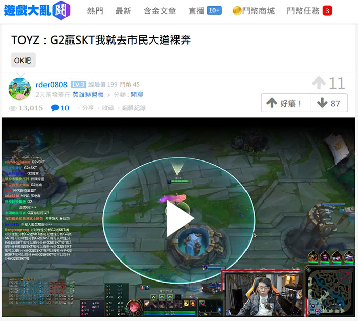 英雄聯盟2019賽季世界大賽由Riot Games公司舉行的第9屆英雄聯盟世界大賽,是2019年英雄聯盟這一電子競技項目的全球範圍內的最高級比賽,今年於10月2日至11月10日期間在德國柏林、西班牙馬德里和法國巴黎舉行。而日前有網友在知名電競社群平台「遊戲大亂鬥」上po出一支影片,內容為知名遊戲實況主「TOYZ」的實況精華,影片中只聽他的聲音不斷激動強調:「如果G2贏SKT,我就去市民大道裸奔!」,誇下海口也令不少人等著看好戲。