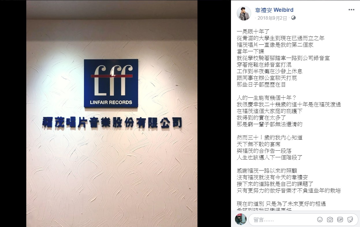 在歌壇已打滾超過十年的韋禮安,去年9月在臉書上寫著,「沒有福茂就沒有今天的韋禮安,接下來的道路就是自己的課題了。只有更努力的做好音樂才不負這些年的栽培,現在的道別,只是為了未來更好的相遇,希望到時我已變得更好。」表達自己將離開福茂唱片,沒想到福茂唱片因合約問題對他提出告訴。