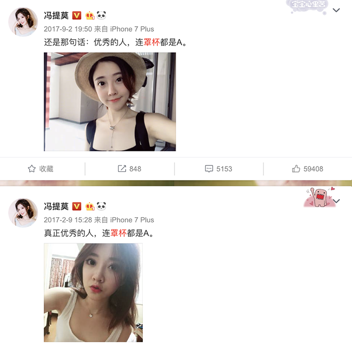 馮提莫擅長與粉絲互動聊天,常常爆出許多好笑的對話,先前,馮提莫在鏡子前拍攝,寫下:「魔镜啊魔镜~谁是世界上最……?」,只見馮提莫身穿一件草綠色蕾絲洋裝,胸前微微露出一小條溝,她也將頭髮扎起,看起來相當俐落卻又不失甜美,而粉絲們也紛紛在留言區吐槽馮提莫:「誰是世界上最平的人?」、「誰是世界上胸最小的人」、「魔鏡啊,魔鏡,告訴我,誰是這個世界上最平的女人」、「誰是世界上有飛機場的女人」,甚至有網友吐槽她胸部的溝都是用畫的。