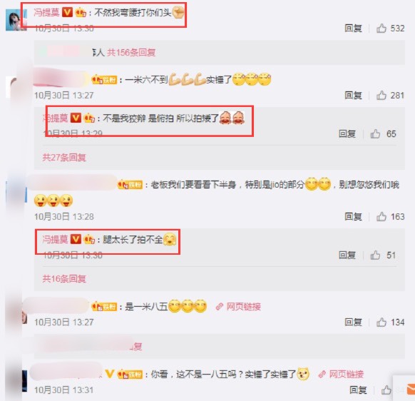 外傳馮提莫的身高只有150公分,此次PO出兩張超萌身高照,似乎想證明自己有超過150公分高,照片中只有拍到上半身,下半身則是隱藏了起來,馮提莫一如往常綁上超萌包子頭,超可愛表情似乎很開心自己超過150公分,跟粉絲道說:「你!不許說我一米五了!」粉絲則也精心地畫了一張一米八五的身高照回禮,互動十分逗趣。然而身高超過150cm的馮提莫過去也曾因為酸民的攻擊導致食慾不振,最瘦時只剩下「38.7kg」。