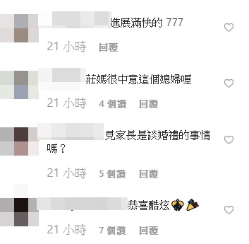 酷炫的「家庭照」一出,立刻引來不少網友紛紛留言表示,「這麼快就要提親了」、「果然要結婚ㄌ」、「怎麼直接見父母了」、「全家福?」、「莊媽很中意這個媳婦喔」、「莊家好媳婦」、「進展滿快的」。
